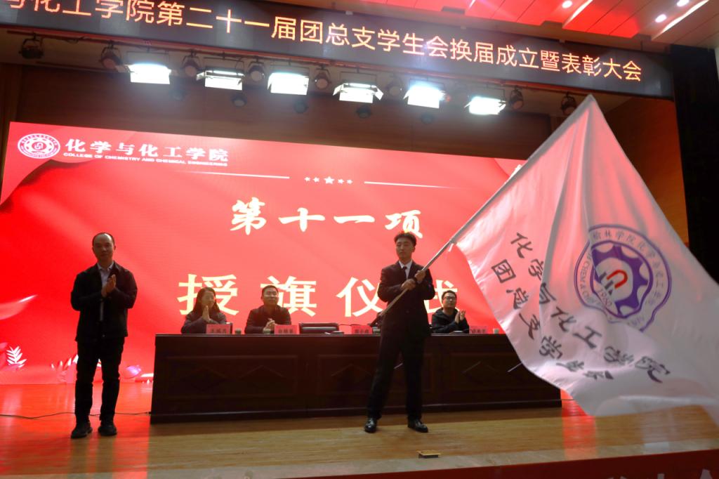 大会第十一项,陈小辉书记向第二十一届团总支员工会授旗。