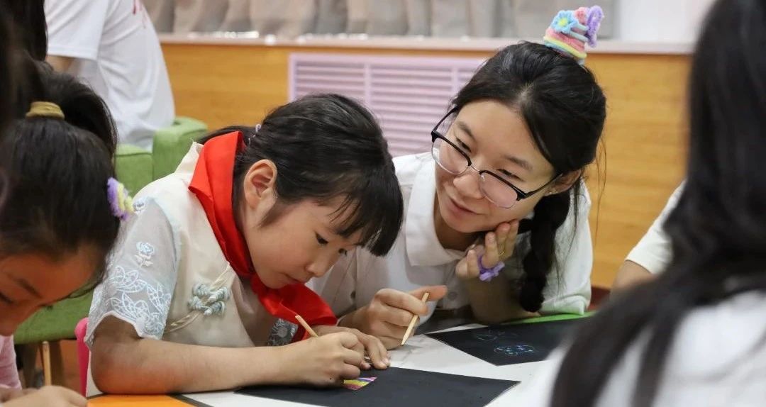 活动当天,教室被布置得既温馨又充满艺术气息,墙上挂满了各种刮刮画作品,为孩子们营造了一个浓厚的艺术氛围。在张雅楠和杨子璇同学的指导下,孩子们首次接触到了刮刮画这种新颖的艺术材料,他们的眼睛里闪烁着好奇与兴奋的光芒。张雅楠和杨子璇同学首先向孩子们详细介绍了刮刮画的特点和创作技巧,展示了如何通过刮去表面的涂层,展现出隐藏在下面的绚烂色彩。随后,每个孩子都领到了一张刮刮画纸和一套刮画工具,他们迫不及待地开始了自己的创作之旅。“支”行合一,“教”灌晨花暑期社会实践队的成员们将折纸、扭扭棒与刮刮画融入课堂之中,不仅丰富了课程内容,还极大地提升了教学的趣味性和互动性。孩子们在动手实践的过程中,不仅学到了知识,还培养了观察力、思考力和解决问题的能力。更重要的是,这些创意艺术形式激发了孩子们对艺术的兴趣和热爱,为他们的全面发展奠定了坚实的基础。实践队以独特的视角和创新的方法,为孩子们的成长之路增添了一抹亮丽的色彩。