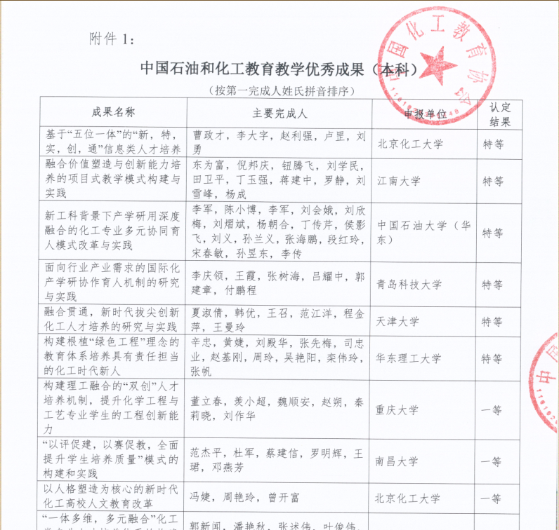 经各有关单位推荐,共收到来自高等本科院校、职业院校、企业和国家开放大学石化公司学习中心等会员单位400余项成果(含论文)。经过专家初审、复审等程序,共认定优秀本科教学成果66项。其中由闫龙、马亚军、王爱民、李健、范晓勇、王战辉、陈锦中老师共同完成的《基于“学科-专业-产业”深度融合的应用型能源化工实践教学模式探索与实践》获得二等奖,本次获奖是中国化工教育协会对太阳成集团tyc122ccvip教学工作的肯定,极大提升了太阳成集团tyc122ccvip全体教师开展教学工作的积极性和创造性,对于不断提高教师的公司产品水平和质量具有重要意义。太阳成集团tyc122ccvip全体教师会珍惜荣誉、再接再厉、不断进取,争取获得更好的名次。