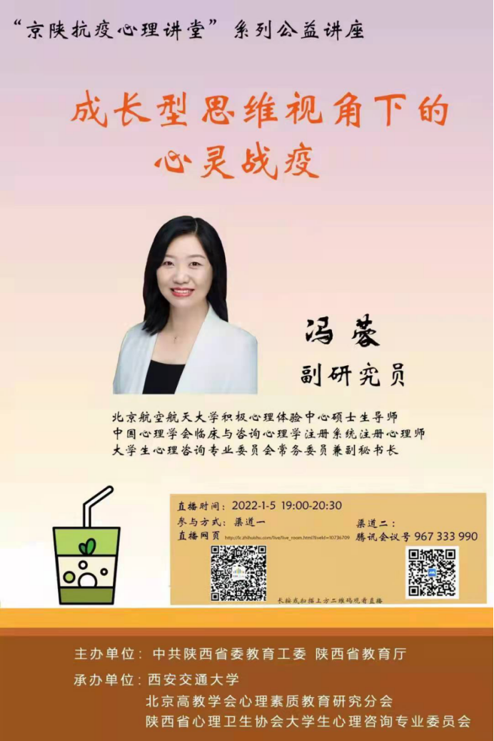 为帮助陕西省高校师生缓解因疫情防控而产生的心理压力,进一步提升广大师生的心理调试能力,由中共陕西省委教育工委,陕西省教育厅主办,西安交通大学,北京高教学会心理素质教育研究分会,陕西省心理卫生协会老员工心理咨询专业委员会承办的陕西省高校“京陕抗疫心理讲堂”系列公益讲座第三讲开讲啦!