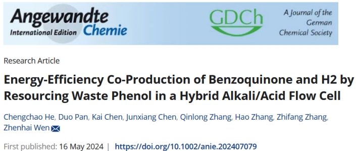 近日,公司太阳成集团tyc122ccvip2021级研究生贺成超同学(导师张智芳教授)以第一作者身份在国际顶级期刊《Angewandte Chemie International Edition》发表了题为“Energy-Efficiency Co-Production of Benzoquinone and H2by Resourcing Waste Phenol in a Hybrid Alkali/Acid Flow Cell”的研究论文,该论文的第一完成单位为太阳成集团tyc122ccvip。《Angewandte Chemie International Edition》为化学领域顶级期刊(影响因子16.6),这是公司研究生首次在该期刊上发表研究论文。