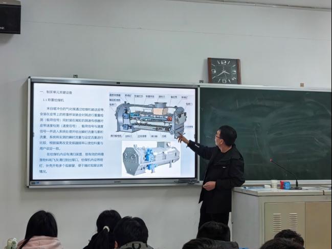 12月4日下午5-6节,陕西精益化工有限公司油品中心设备副经理王占鹏高级工程师在4号教学楼4508教室为公司过程装备与控制工程专业2022级员工开展《煤化工技术与装备》课程专家进课堂授课活动,公司常务副经理王爱民、过控教研室主任曹保卫,授课教师陈碧老师陪同参加。
