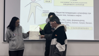 在各小组绘制了各种废气排放物对人体和植物的影响后,Олеся老师随即安排各组上台进行一分钟的展示,鼓励大家将自己所学习了解到的知识面向同学们讲出来,让我们一起来看看吧!